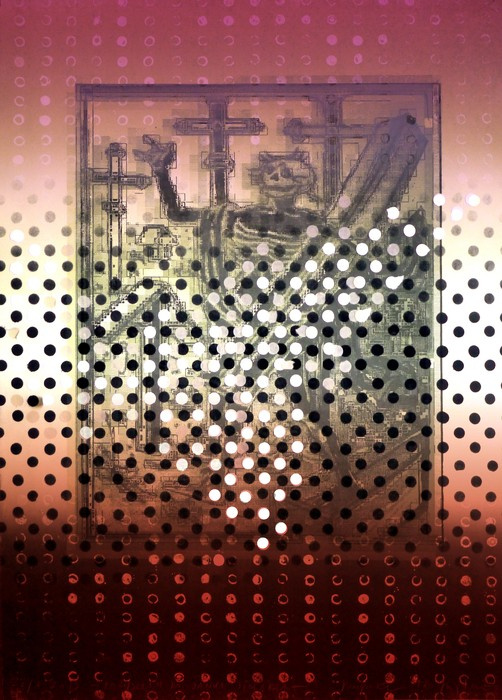 Grafika wykonana w technice litografii z wykorzystaniem transferu ksero, kolażu, oraz